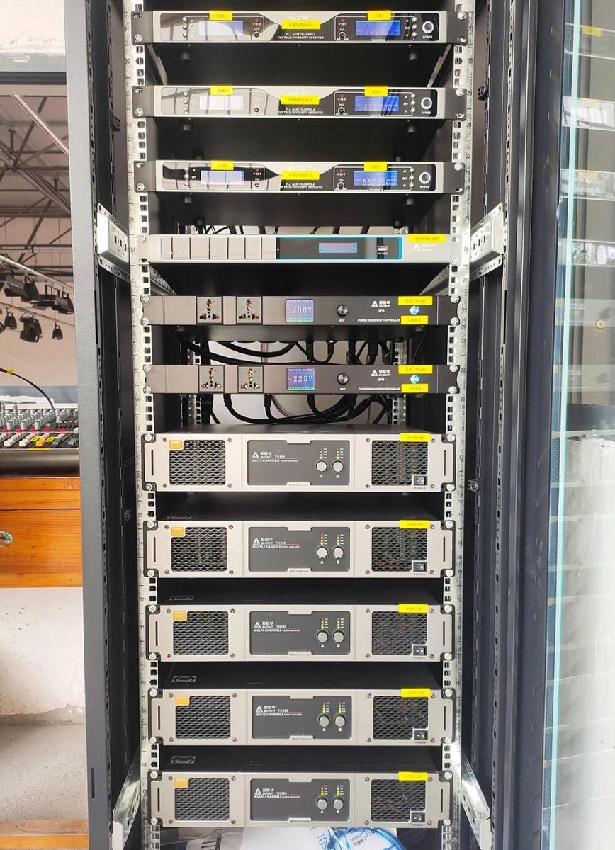 設(shè)計(jì)12寸多功能音箱10只,其中2只用于舞臺(tái)返聽(tīng),8只用于觀眾區(qū)擴(kuò)聲,H類(lèi)功率放大器5臺(tái),真分集一拖二手持、頭戴話筒各2套,周邊搭配AM系列多功能調(diào)音臺(tái),ADSP系列數(shù)字音頻處理器及電源時(shí)序器;